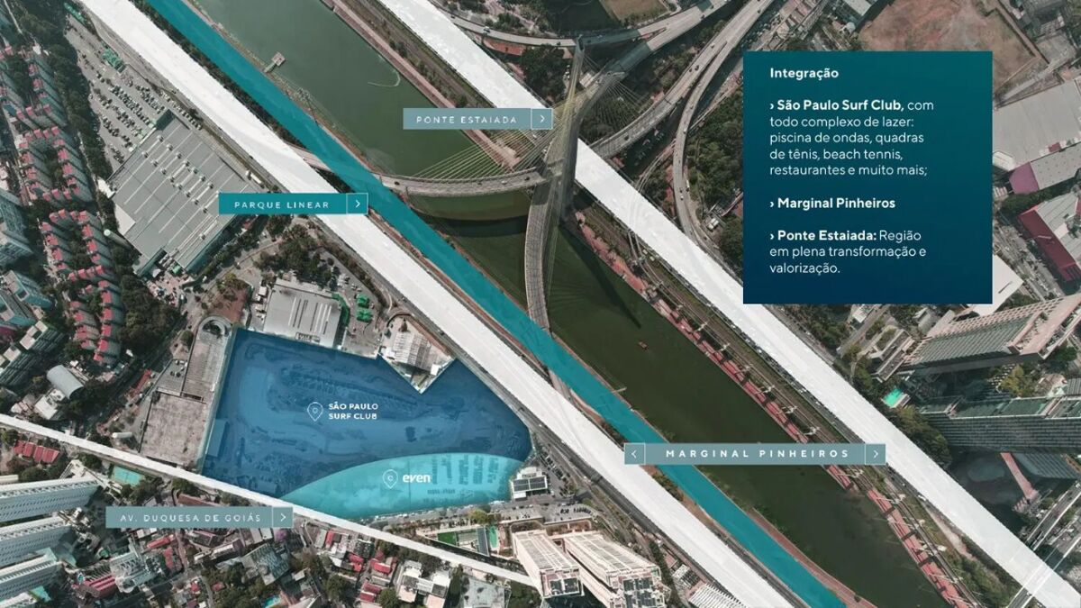 Localizado estrategicamente na Avenida Duquesa de Goiás 523, no prestigiado bairro de Cidade Jardim, o São Paulo Bay oferece um lugar de pausa e respiro, sem desconectar você da energia e do movimento de São Paulo. Esta localização privilegiada, com proximidade à icônica Ponte Estaiada e à Marginal Pinheiros, garante mobilidade e acesso facilitado aos principais pontos da cidade, em uma região em plena transformação e valorização.